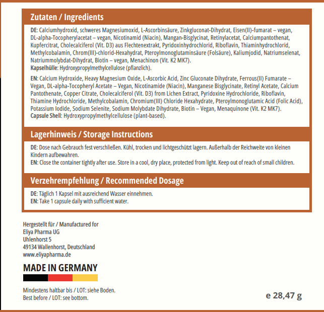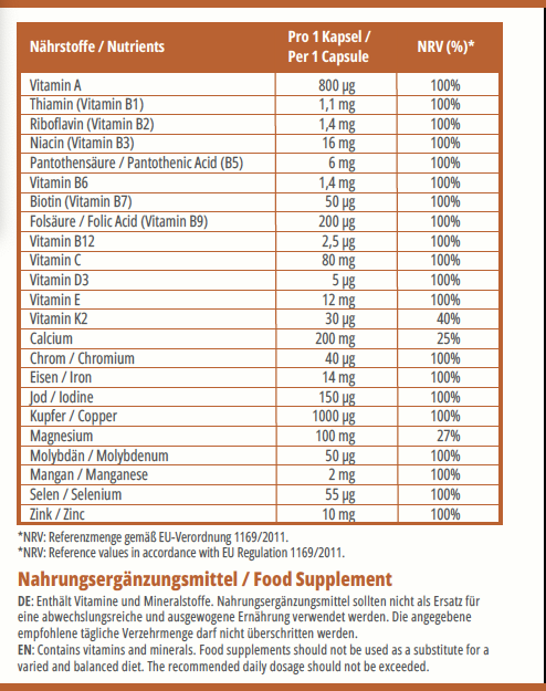 Calciumhydroxid, Magnesiumoxid Schwer, L-Ascorbinsäure, Zinkgluconat Dihydrat, Eisen(II)- fumarat-Vegan, DL-alpha-Tocopherylacetat-Vegan, Nicotinamid (Niacin), Mangan Bisglycinat,Retinylacetat, Calciumpantothenat, Kupfercitrat, Cholecalciferol (Vit. D3) aus Flechtenextrakt,Pyridoxinhydrochlorid, Riboflavin, Thiaminhydrochlorid, Methylcobalamin, Chrom(III)-Chlorid Hexahydrat,Pteroylmonoglutaminsäure (Folsäure), Kaliumjodid, Natriumselenat, Natriummolybdat Dihydrat,Biotin-Vegan, Menachinon (Vit.K2 MK7).