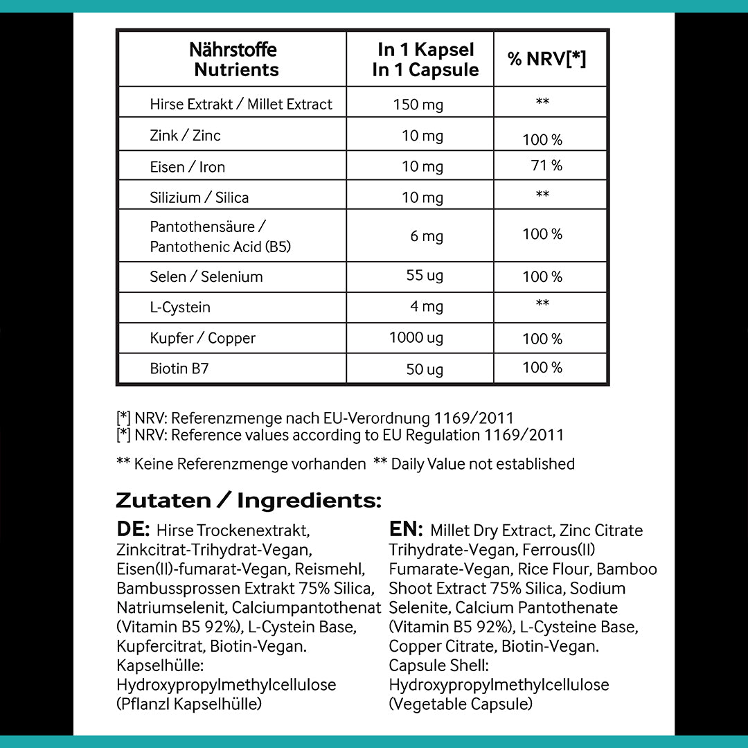 Hirse Trockenextrakt,Zinkcitrat-Trihydrat-Vegan, Eisen(II)-fumarat-Vegan, Reismehl, Bambussprossen Extrakt 75% Silica, Natriumselenit, Calciumpantothenat (Vitamin B5 92%), L-Cystein Base, Kupfercitrat, Biotin-Vegan. Kapselhülle: Hydroxypropylmethylcellulose (Pflanzl Kapselhülle)